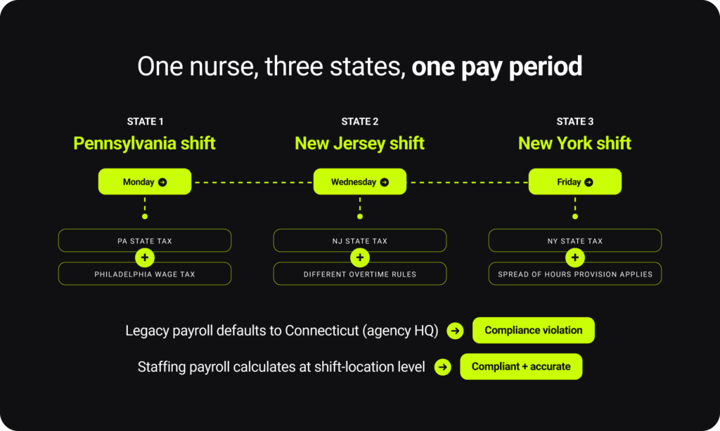 An associate might work shifts in Pennsylvania, New Jersey, and New York in the same week. Each shift has different overtime rules, tax requirements, and leave policies. Your payroll software needs to calculate taxes and compliance at the shift-location level, not based on where the worker lives or where your company is headquartered.