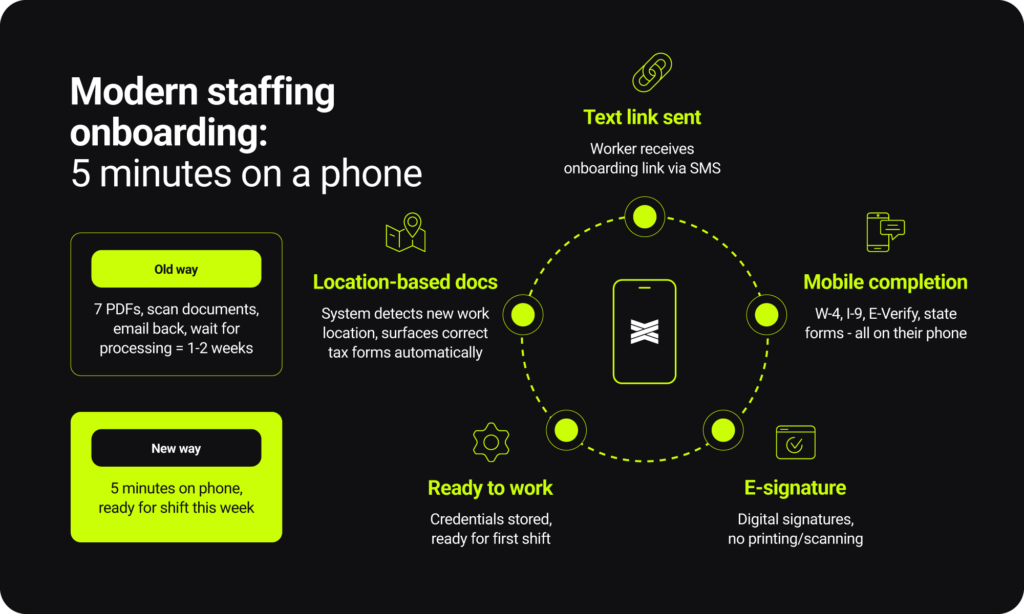 After implementing proper onboarding workflows, one agency reported: “We’re managing everything that used to be manual. The ability to text onboarding links to workers and have them self-complete everything on their phone has been huge.”
