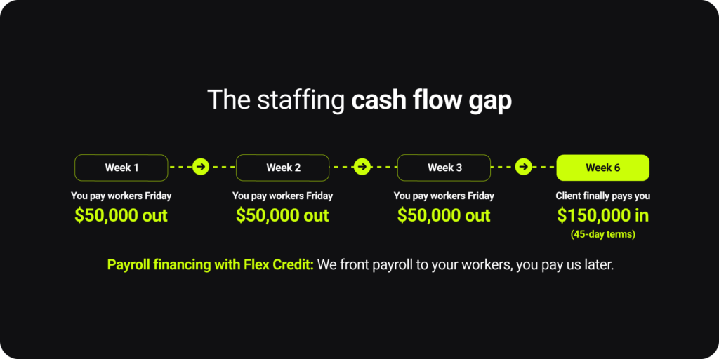 This is the reality of staffing: your workers need to be paid Friday, but your client is on 45-day payment terms (or longer). You’re stuck fronting payroll costs with your working capital, often for hundreds of thousands of dollars each week. Unfortunately, growing agencies face the biggest squeeze. When you’re landing new clients and taking on more workers, you’re funding more payroll before receiving more revenue. Growth shouldn’t mean a cash flow crisis, but that’s exactly what happens.